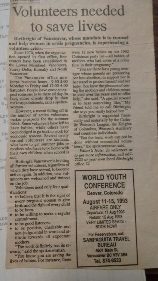 Birthright of Vancouver, whose mandate is to counsel and help women in crisis pregnancies, is experiencing a volunteer crisis....